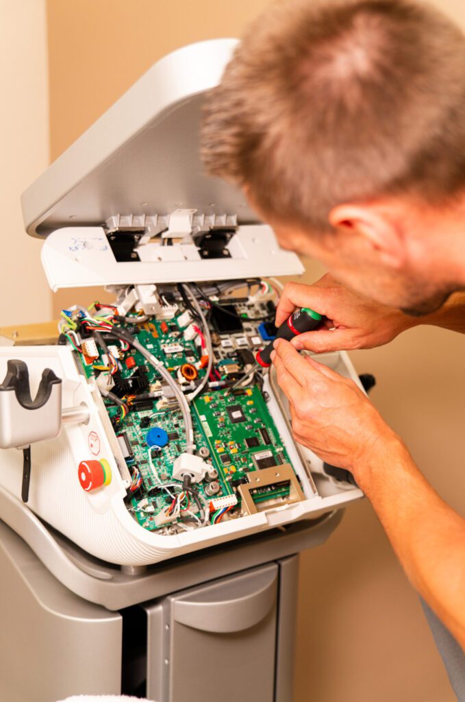 U bij Dermatech ook terecht kan voor het onderhoud en herstellingen van lasers, diverse schoonheidsapparatuur en behandelstoelen.